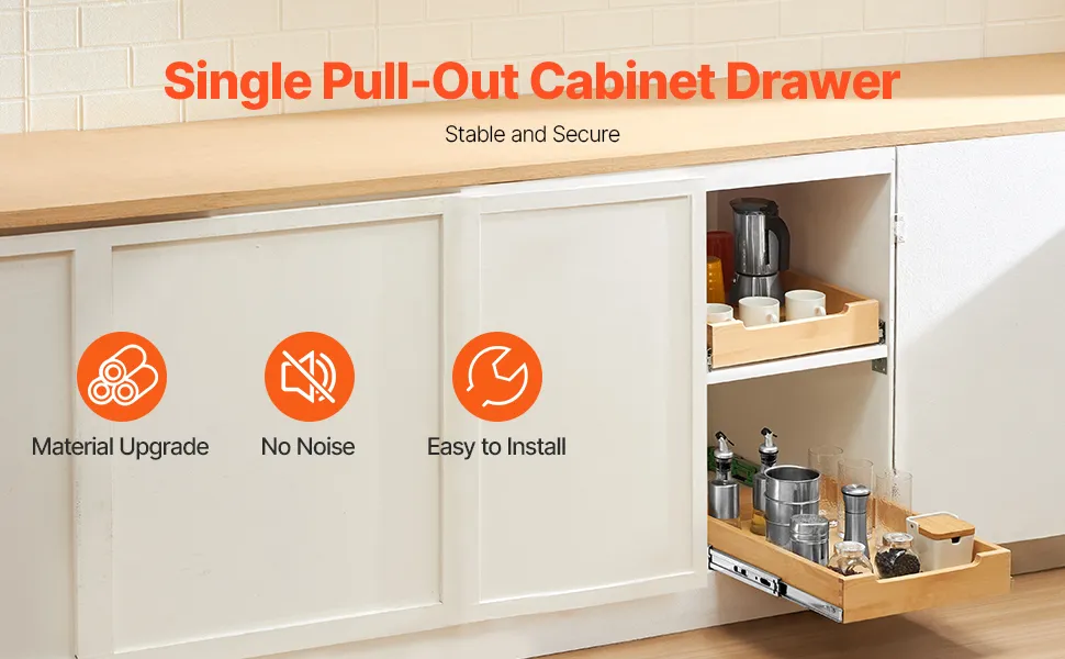Soft-Close-Schienen aus Metall: Die ausziehbare Schrankschublade verfügt über robuste Soft-Close-Schienen aus Metall, die sich vollständig ausziehen lassen und dabei sanft und leise funktionieren. Vollständig ausgezogen trägt sie ein Gewicht von bis zu 60 lbs (27 kg). Der sanfte Ausziehmechanismus ist verformungsbeständig, bietet eine hohe Tragfähigkeit und einen extrem leisen Betrieb.