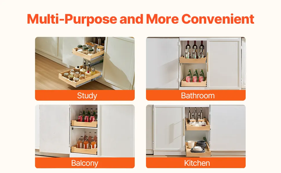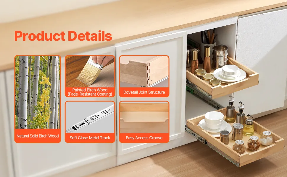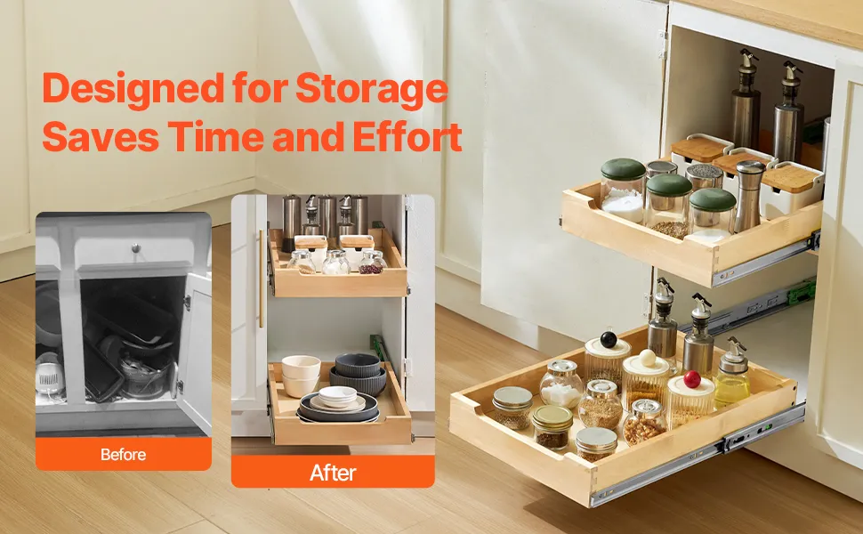 Dieser ausziehbare Holzboden mit sanftem Schließmechanismus ist ideal für den Einsatz in Küchenschränken, Unter- und Vorratsschränken. Es maximiert die Raumausnutzung und erleichtert die Aufbewahrung und den Zugriff auf Töpfe, Pfannen und Küchenutensilien.