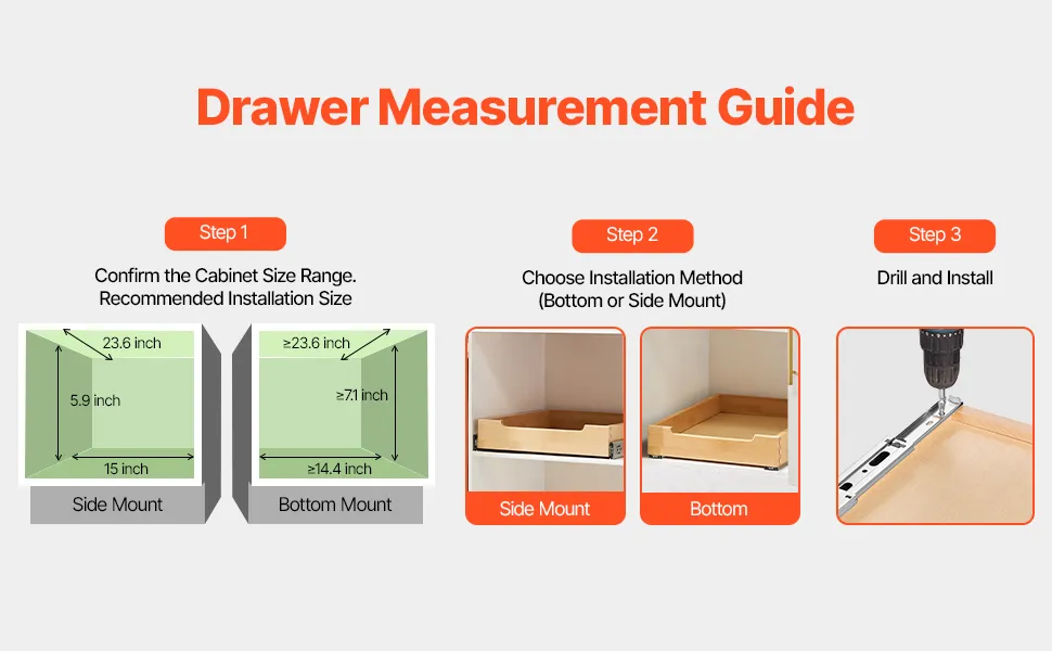 Einfache Installation: Das ausziehbare Holzregal mit Soft-Close-Funktion bietet 2 Installationsmethoden für die Schienen und wird mit einer Schritt-für-Schritt-Anleitung sowie allen erforderlichen Zubehörteilen geliefert. Empfohlene Installationsmaße: Seitenmontage: ≥ 15 x ≥ 23,6 x ≥ 5,9 Zoll; Bodenmontage: ≥ 14,4 x ≥ 23,6 x ≥ 7,1 Zoll. Messen Sie Ihren Schrank vor dem Kauf unbedingt aus und wählen Sie die entsprechende Größe aus.