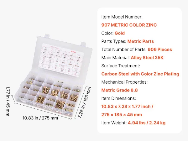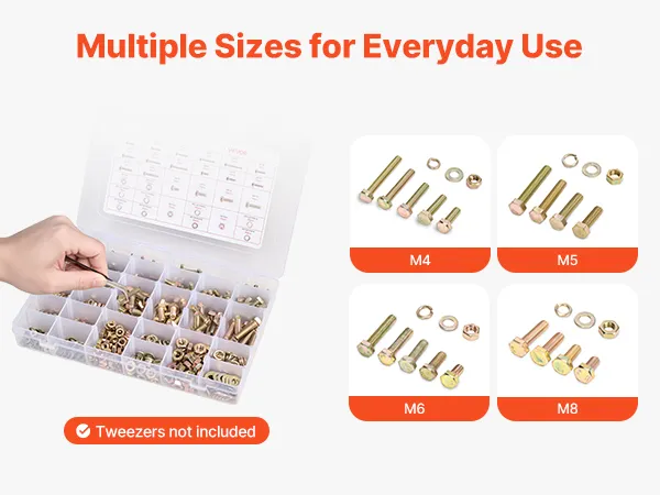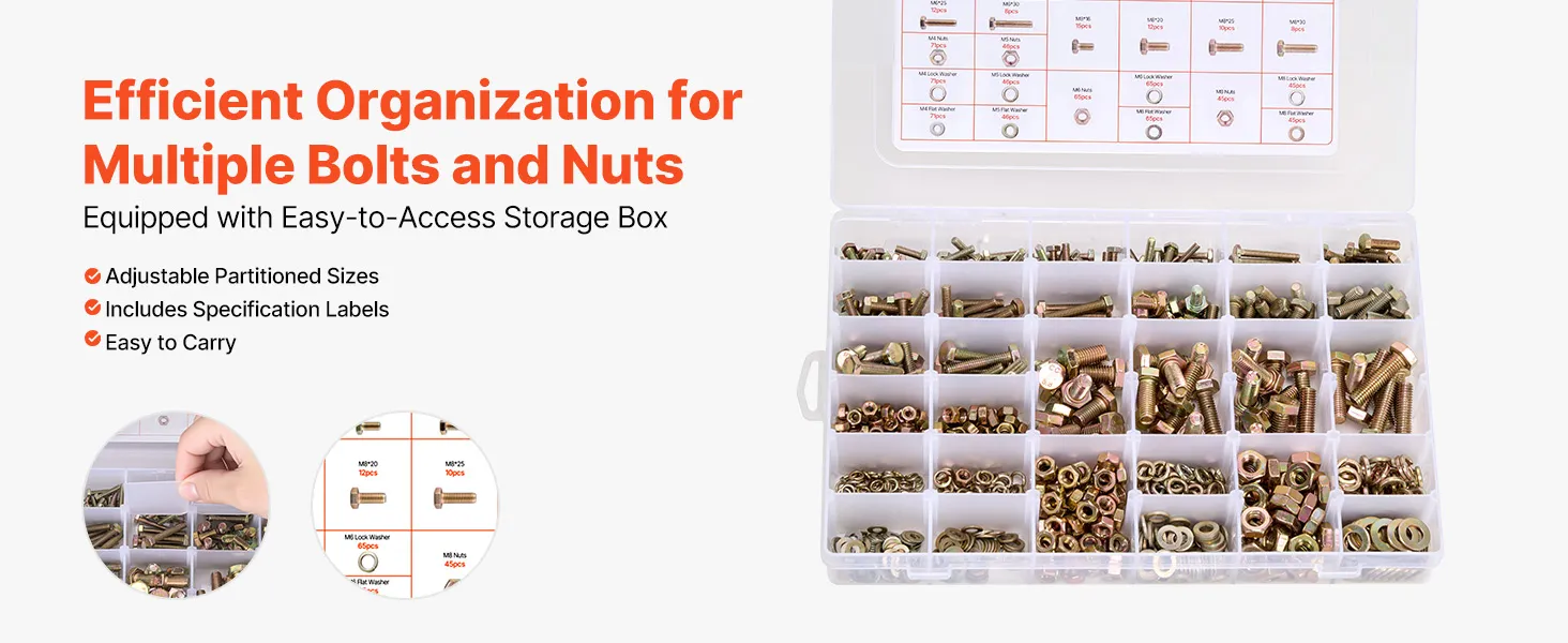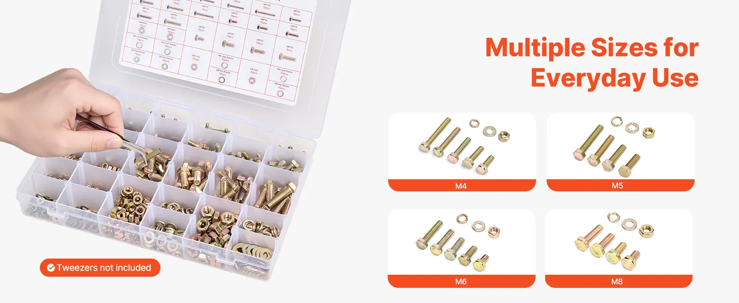 Mit einer großen Auswahl an Schrauben, Muttern, Unterlegscheiben und anderen Komponenten in verschiedenen Größen sorgt dieses Set für starke Verbindungen für unterschiedliche Materialien, sodass Sie leicht die richtigen Teile für Ihre Aufgaben finden.