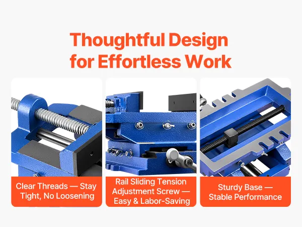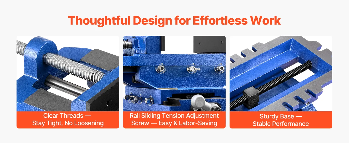 Unser XY-Achsen-Bohrmaschinenschraubstock verfügt über transparente Gewinde, die fest sitzen und sich nicht lösen, wodurch eine stabile Klemmung gewährleistet wird. Der robuste Sockel sorgt für Stabilität während des Betriebs und ermöglicht sicheres und zuverlässiges Arbeiten.
