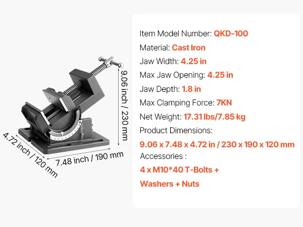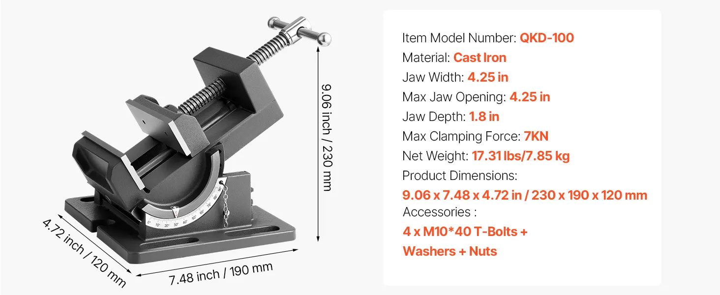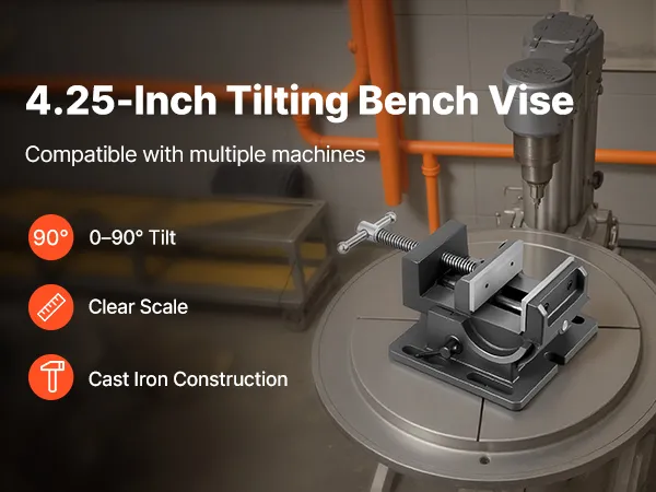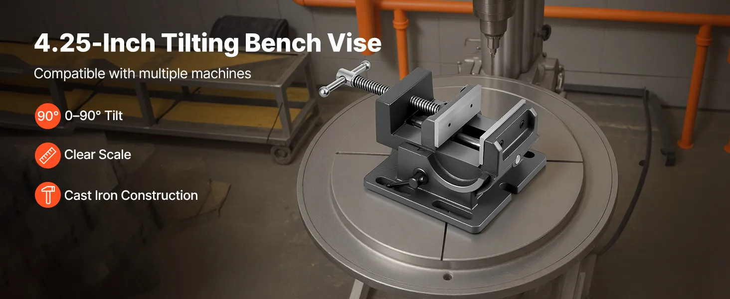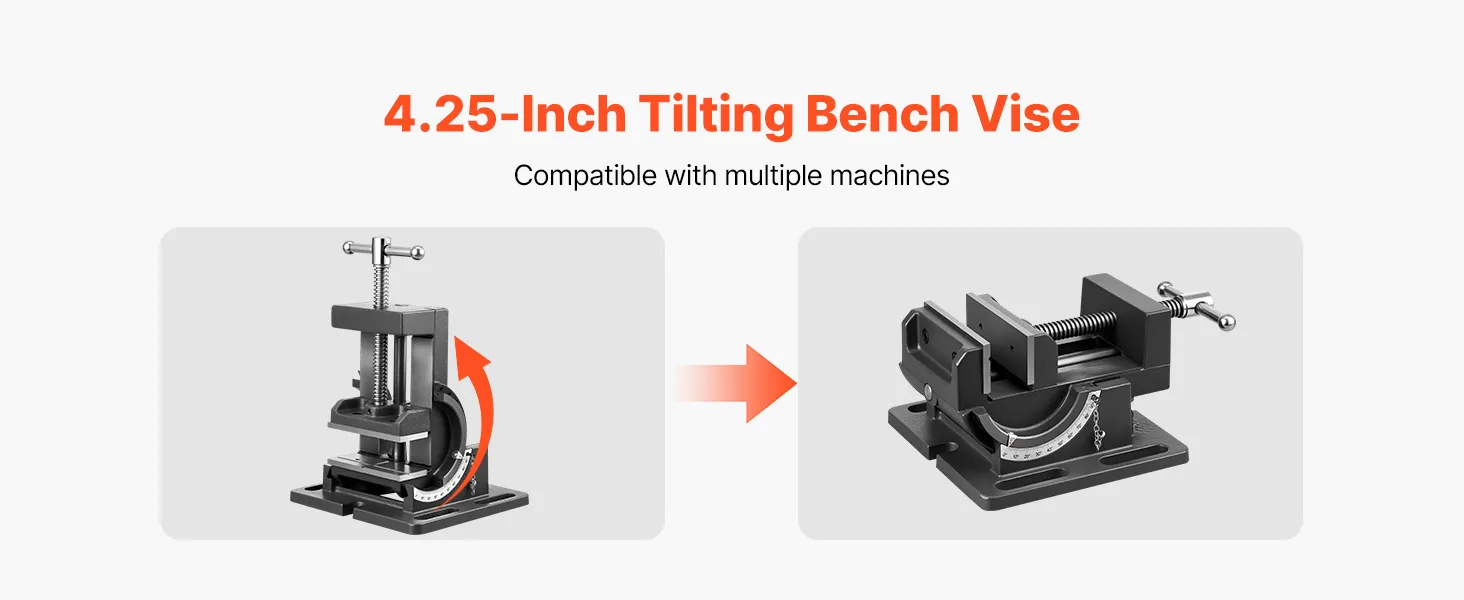 Dieser Kippschraubstock aus hochfestem Gusseisen verfügt über eine klare Skala zur präzisen Winkeleinstellung. Er unterstützt einen Neigungswinkel von 0–90° und ist ideal für Fräsmaschinen, Bohrmaschinen und mehr.