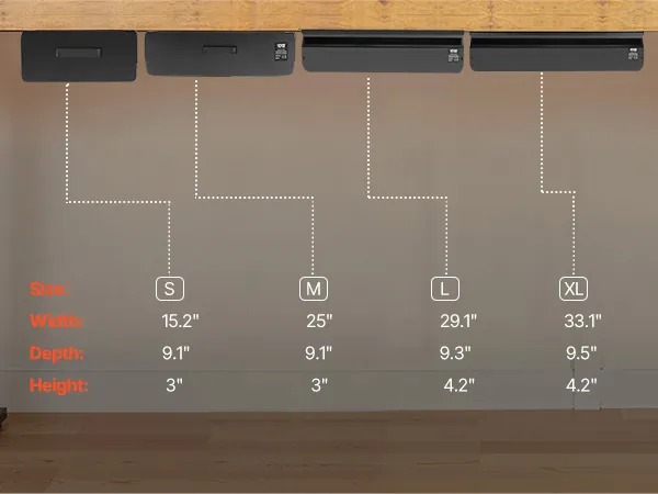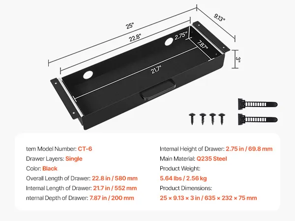 11 lbs / 5 kg Tragkraft: Diese Untertischschublade (Innenmaße: 21,7 Zoll / 552 mm L, 7,87 Zoll / 200 mm T, 2,75 Zoll / 69,8 mm H) bietet zusätzlichen Stauraum unter Ihrem Schreibtisch, ideal für Schreibwaren und kleine Gegenstände. Sie ist mit einer soliden Metallstruktur gefertigt und mit 4 Befestigungspunkten gesichert, sodass sie auch bei längerem Gebrauch stabil und sicher bleibt. (Hinweis: Ihr Schreibtisch muss mindestens 15,1 lbs / 6,8 kg tragen können.)