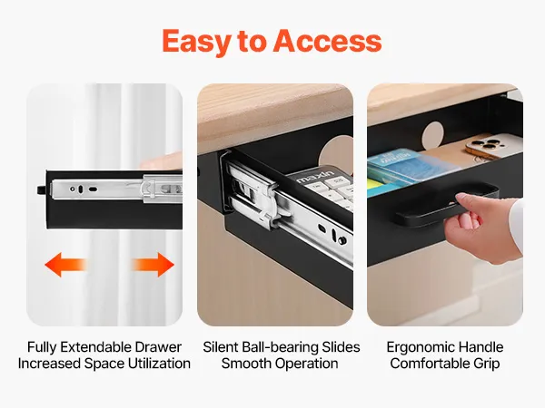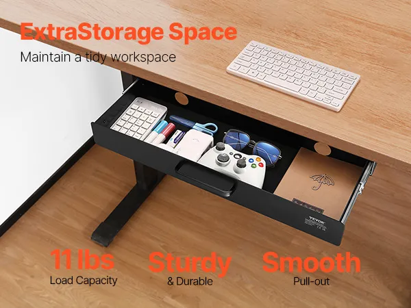 Diese Schublade unter dem Schreibtisch trägt bis zu 5 kg und bietet wertvollen zusätzlichen Platz für Ihren Schreibtisch. Halten Sie Ihren Arbeitsplatz organisiert und aufgeräumt, damit Sie sich ohne Ablenkung auf Ihre Arbeit konzentrieren können.