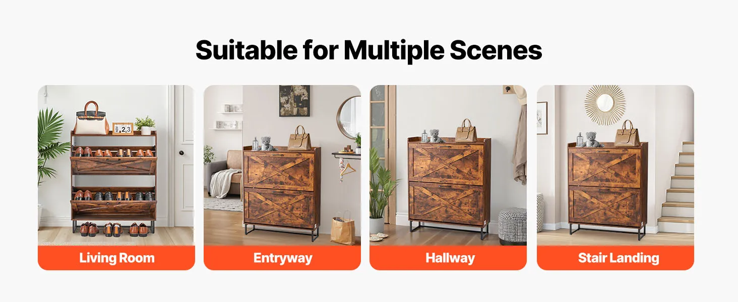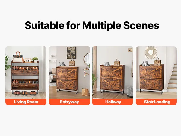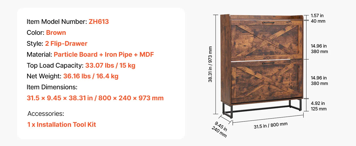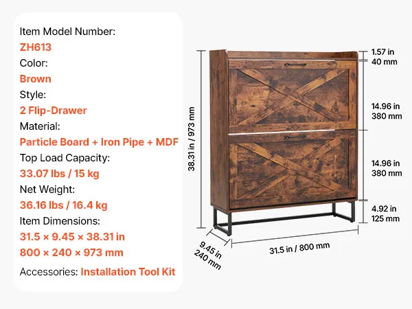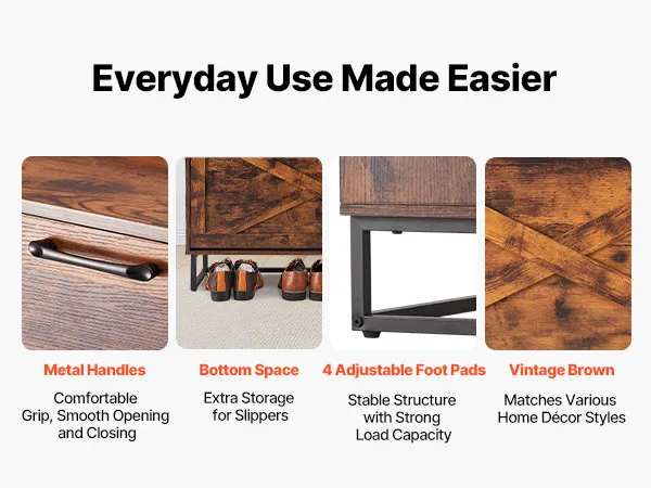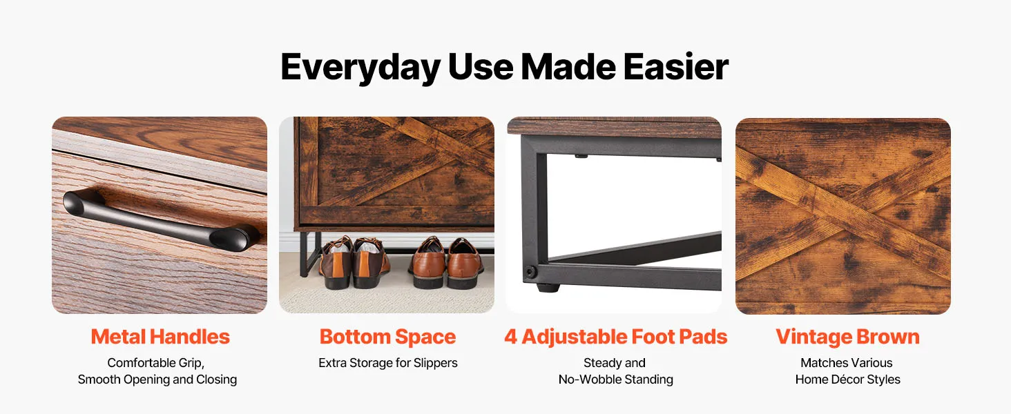 Das Vintage-Braun-Finish passt zu jeder Wohneinrichtung und verfügt über benutzerfreundliche Metallgriffe. Im unteren Fach finden Alltagsschuhe Platz. Verstellbare Füße sorgen für einen stabilen Stand und bieten Komfort und Sicherheit.