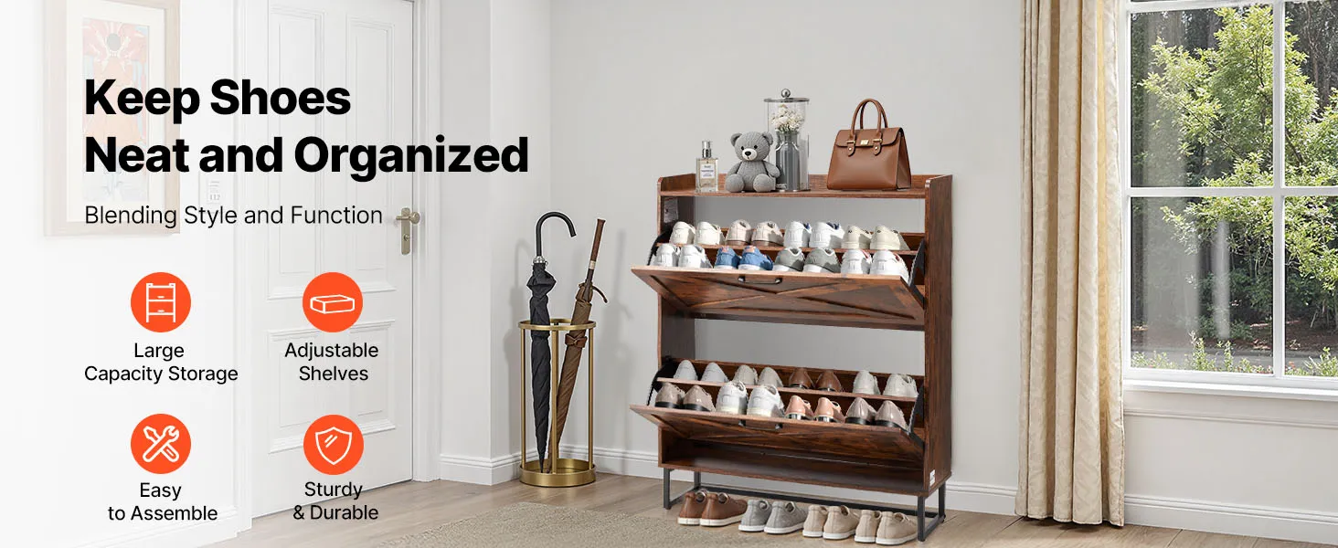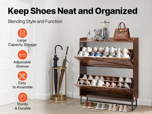 Großes Fassungsvermögen: Mit zwei Klappschubladen, jede mit zwei Ebenen, sodass häufig getragene Schuhe mit einem einzigen Klick zugänglich sind. Die obere Fläche bietet Platz für Dekorationen oder Vasen, das untere Fach für Hausschuhe