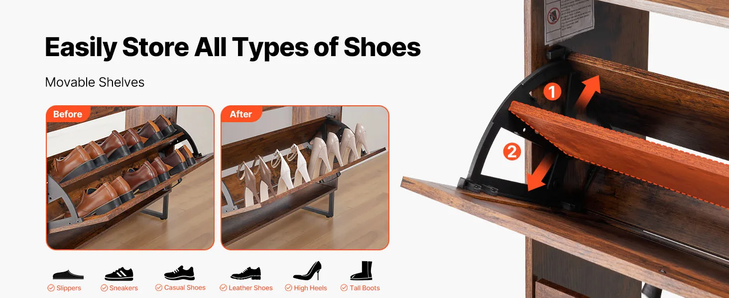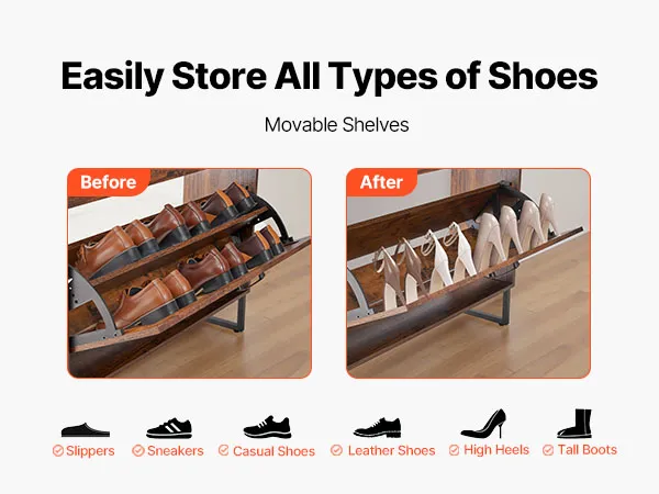Verstellbare Regale: Die Regale sind in zwei Positionen verstellbar und die mittlere Trennwand kann entfernt werden, um Schuhe unterschiedlicher Höhe und Größe unterzubringen. Passend für hohe Stiefel, Stiefeletten, Pumps, flache Schuhe und Turnschuhe, um den Schuhbedarf der ganzen Familie zu decken