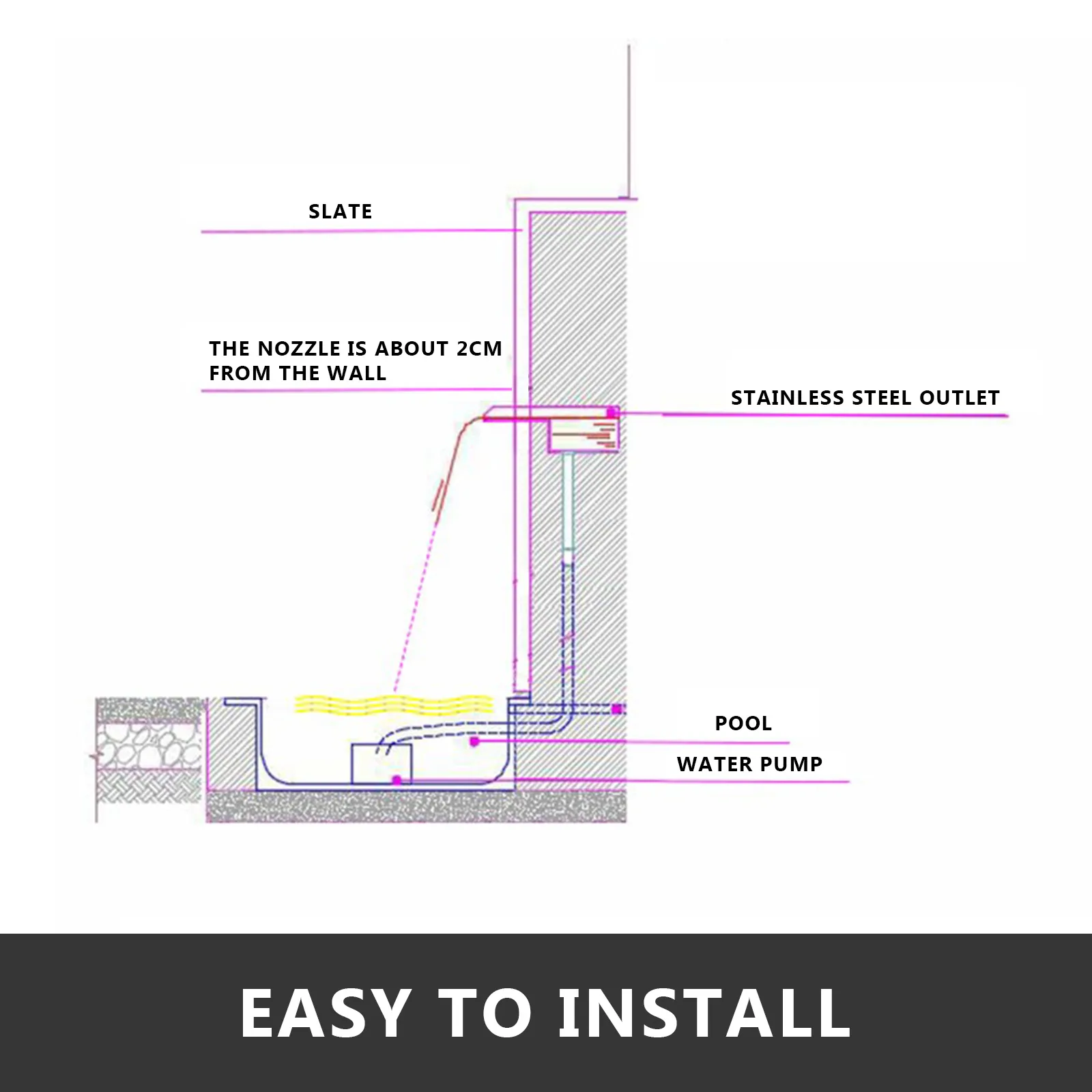 Dieser Wasserfallüberlauf wertet Ihren Garten oder Pool auf. Er hat einen breiten, abgeschrägten Wasserauslass und einen Teich am Boden. Dieses Design erzeugt einen „Wasserfalleffekt“. Der Wasserfluss ist gleichmäßig und sanft. Die beruhigenden Melodien, die er erzeugt, helfen, Ihren Geist zu beruhigen. Sie haben das Gefühl, mit der Natur verbunden zu sein. Ihr Gefühl der Verbundenheit wird verstärkt. Der Wasserfall verleiht jedem Außenbereich Eleganz und Stil. Er ist eine dekorative Ergänzung für Ihren Garten, Ihre Terrasse, Ihren Teich oder Ihren Swimmingpool! Das anmutige Wasser fließt und macht ihn unglaublich schön.
