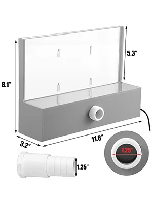 【ABMESSUNG DES WASSERFALL】 - Gesamtgröße: B x T x H (30 x 8 x 21 cm). Der elektrische Anschluss befindet sich auf der rechten Seite. Unten befindet sich eine 32 mm (1,25") große Rohröffnung. Außendurchmesser des Steckers: 32 mm.