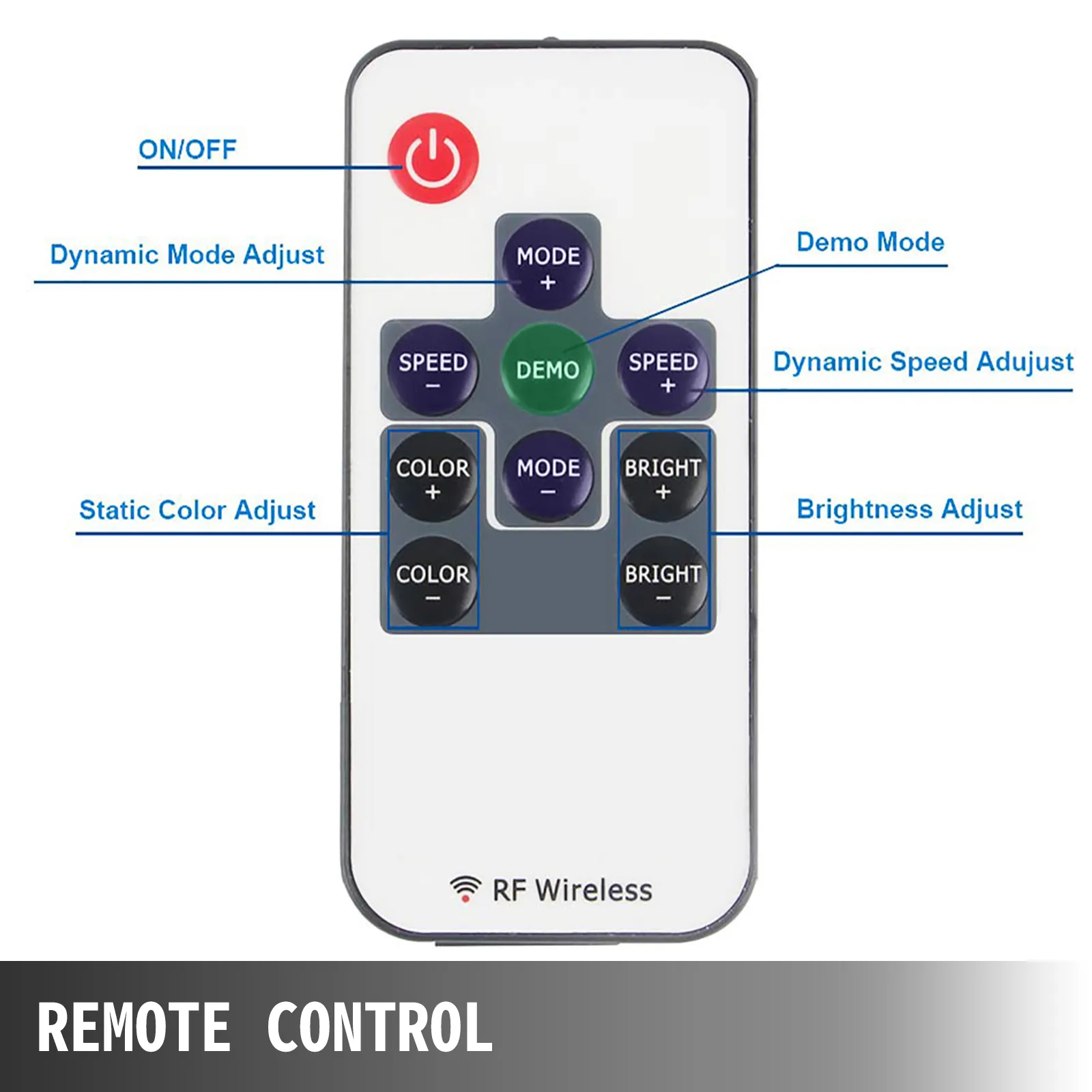 Siebzehn verschiedene Farben können über die RF-Fernbedienung geändert werden. Dazu gehören die Funktion für Helligkeit, Farbe und Geschwindigkeit der Modi, um ein optimales Erlebnis zu gewährleisten.