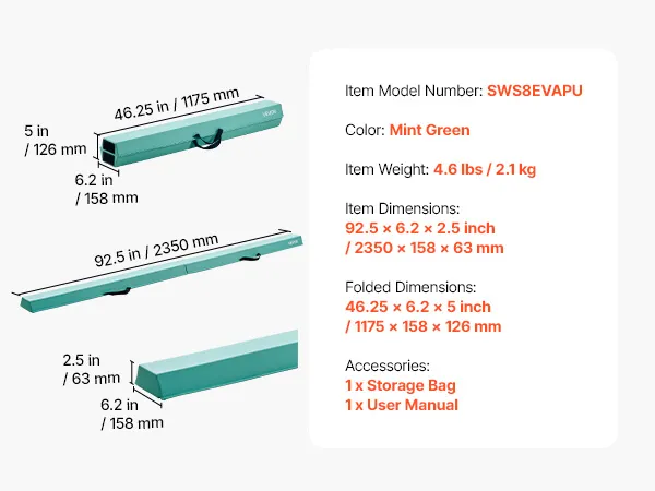 VEVOR Schwebebalken Gymnastik Kinder klappbar 2,35 m, 90,7 kg belastbarer Gymnastikbalken mit rutschfesten Unterseiten, Balance Balken Balancierbalken mit Tragetasche für Fitnessstudio, Mintgrün