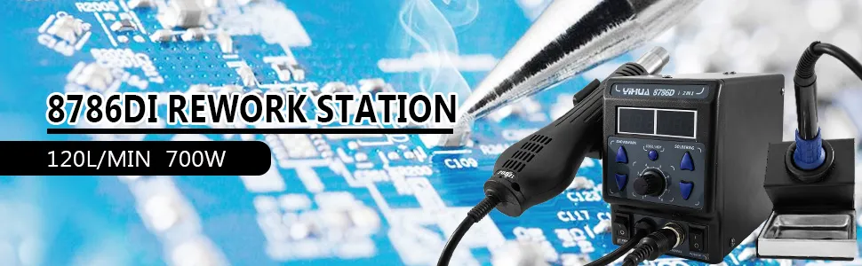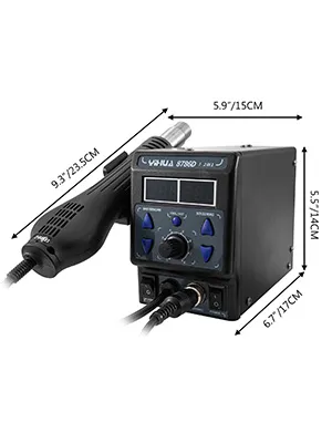 Die 8786DI Lötstation integiert mit der bleifreien Löt-Rework-Station, Heißluftpiszole und Netzteil. Sie verwendet die neueste PID-Programmsteuerungstechnologie mit Mikrocomputer-Prozessor, um die richtige Temperatur für die Luftpistolenleistung genau zu berechnen und zu erzeugen.