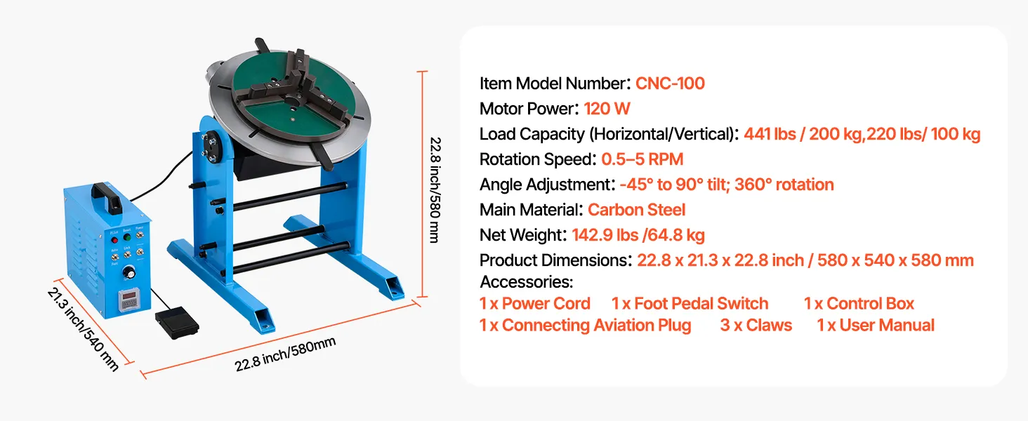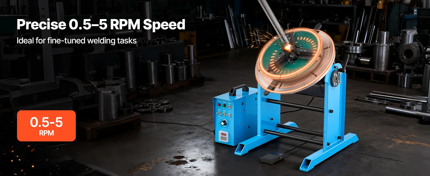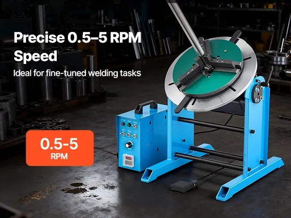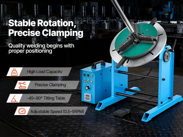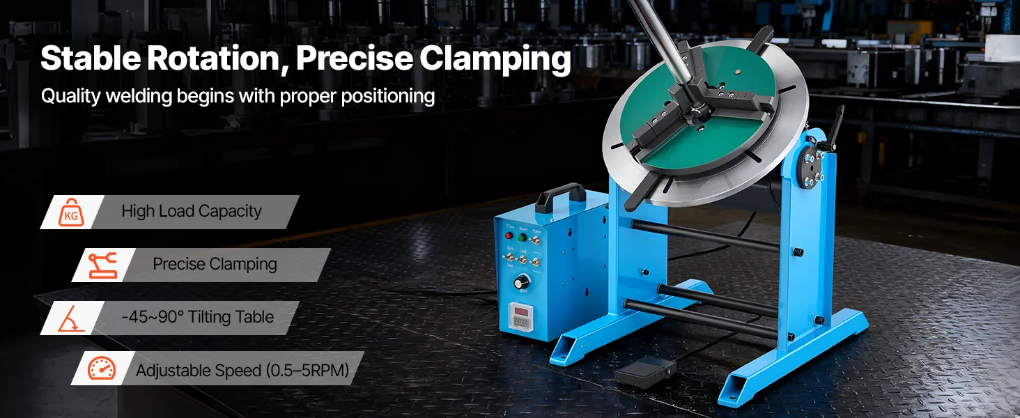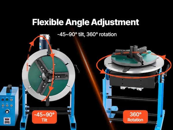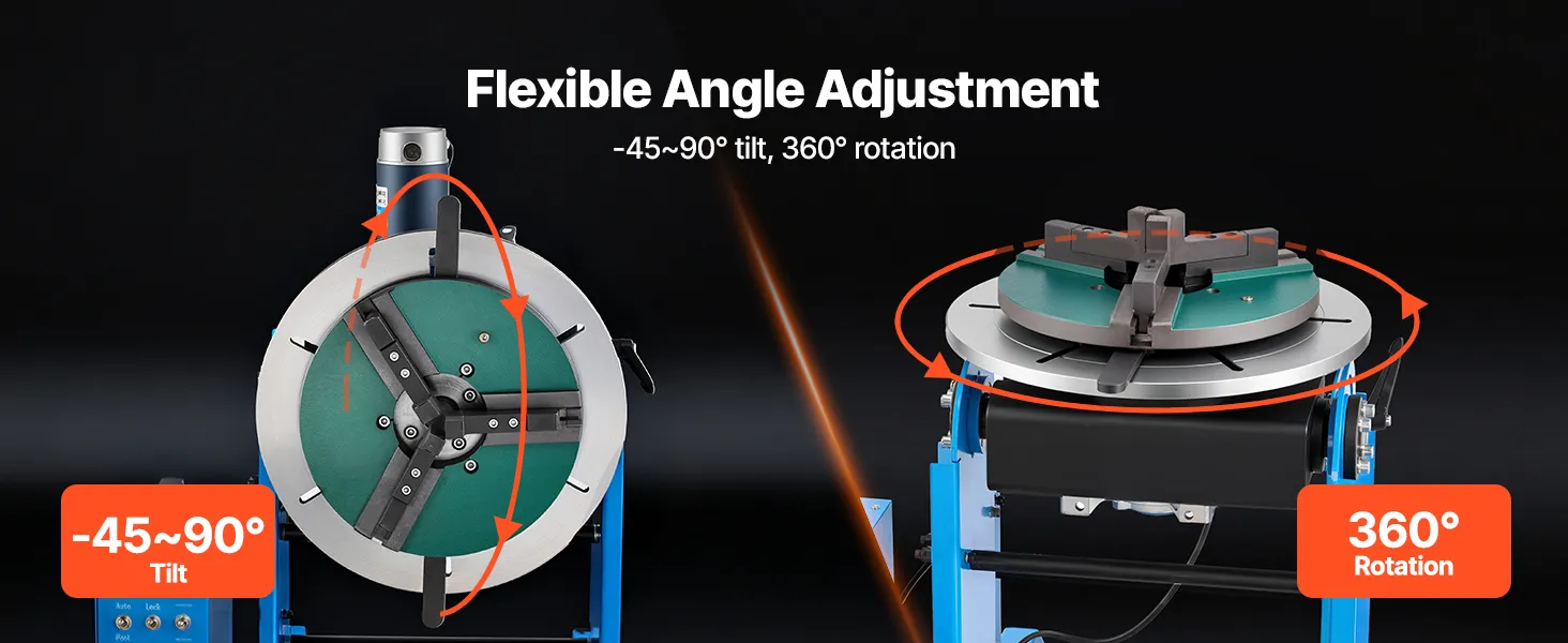Die Neigung von -45° bis 90° und die sanfte 360°-Drehung gewährleisten präzises Ausrichten. Unser Schweißpositionier-Drehtisch verfügt über einen robusten Rahmen aus Kohlenstoffstahl und einen großen Spannbereich. Das Fußpedal reduziert die Belastung des Bedieners.