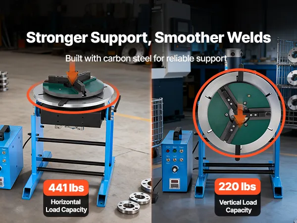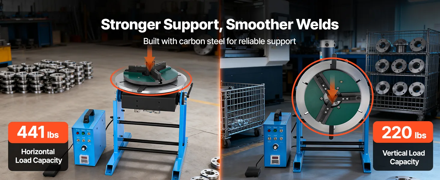 Hohe Belastbarkeit: Dieser drehbare Schweißpositionierer trägt bis zu 200 kg (441 lbs) horizontal und 100 kg (220 lbs) vertikal. Die hochwertige Konstruktion aus Kohlenstoffstahl gewährleistet einen stabilen Betrieb auch bei anspruchsvollen Schweißarbeiten