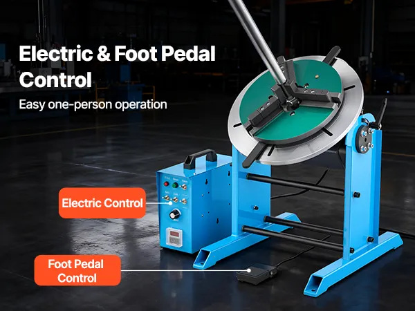 Flexible und einfache Steuerung: Unsere Positionier-Drehtischmaschine verfügt über eine elektrische Steuerung und einen Fußschalter für müheloses, freihändiges Bedienen. Sie steigert die Schweißeffizienz und reduziert die Ermüdung des Bedieners