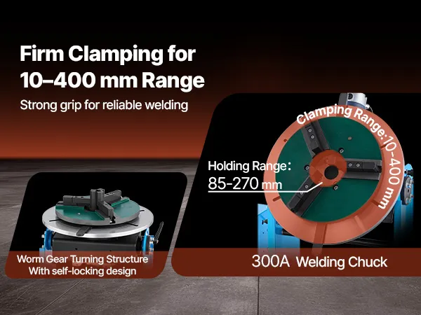 Weitbereichs-Schweißfutter: Das 300A-Futter bietet einen Spannbereich von 0,4 bis 15,8 Zoll (10,16 bis 401,32 mm) und einen Haltebereich von 3,4 bis10,6 Zoll (86,36 bis 269,24 mm), wodurch unser Schweißpositionierer-Drehtisch eine breite Palette von Werkstücken sicher halten kann