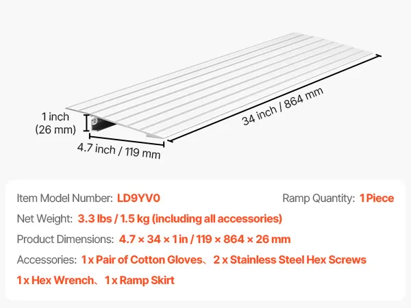 VEVOR Türschwellenrampe, 196x864x26 mm, Rollstuhlrampe aus Aluminiumlegierung mit einer Tragkraft von 360 kg, Bordsteinrampe für Heimtreppen für Rollstühle Roller Gehhilfen Fahrräder Dreiräder