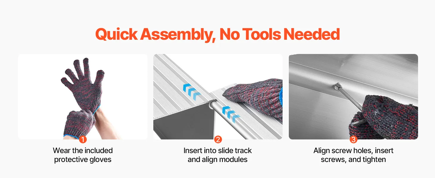 Sicher und stabil: Die Rampe an der Vordertür wird mit Schraubverbindern fest verriegelt, sodass die Einheiten ohne Verrutschen verbunden bleiben. Für eine einfache und sichere Montage legen wir sogar Schutzhandschuhe bei.
