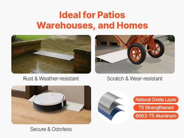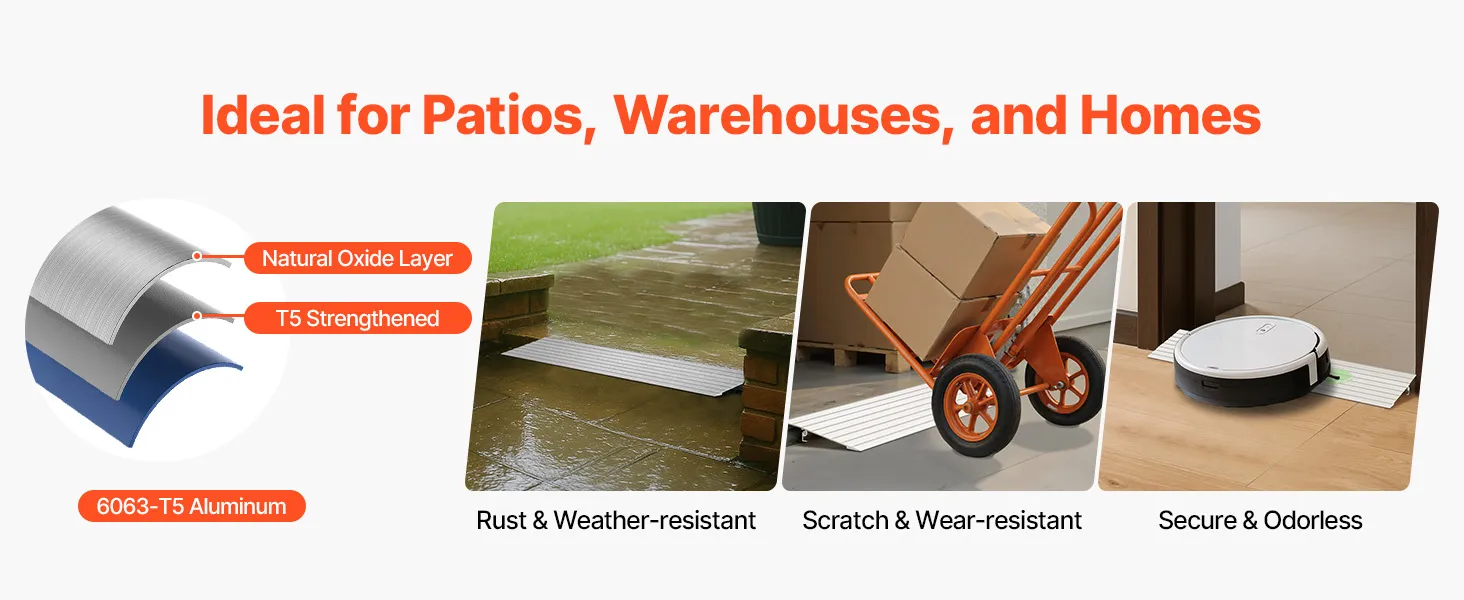 Hohe Belastbarkeit: Diese Türschwellenrampe aus 6063-T5 Flugzeugaluminium mit einem soliden 2-mm-Kern trägt bis zu 360 kg. Sie bleibt auch unter schweren Rollstühlen, Karren oder Ausrüstung stabil.