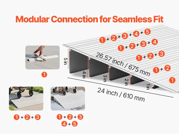 Flexible Passform: Diese Auffahrrampe passt auf Standardschwellen mit 5 Zoll (12,7 cm) und kann für andere Höhen erweitert werden. Keine feststeckenden Räder mehr – nur sanfte Übergänge, die den täglichen Zugang erleichtern