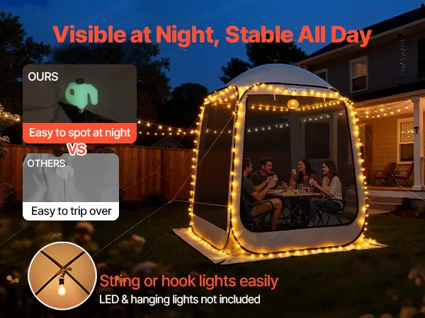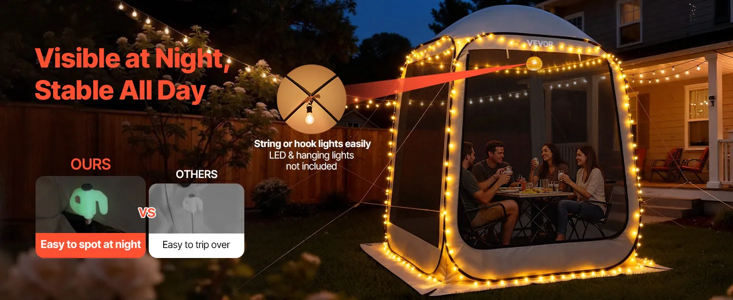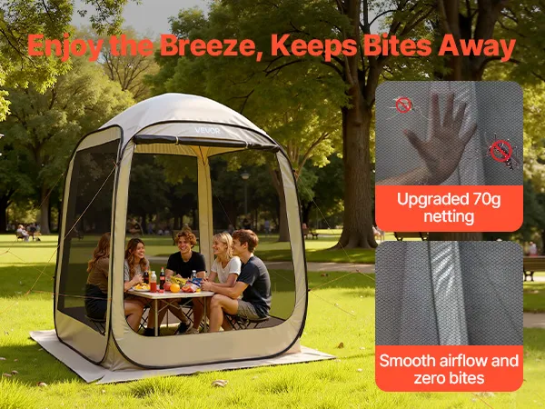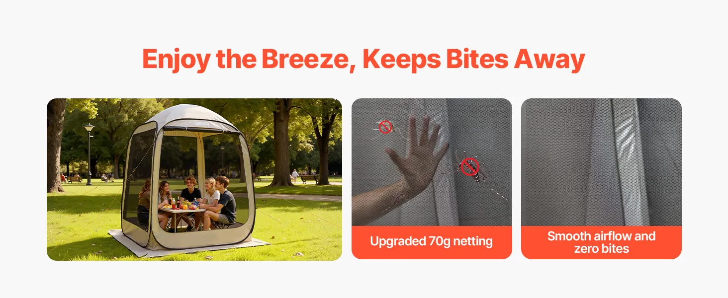 Schutz vor Insektenstichen und Witterungseinflüssen: Das 360°-Netzgewebe mit hoher Dichte hält Insektenstiche fern, während das wasserdichte und sonnenbeständige 300D-Oxford-Gewebe Sie vor Sonne und Regen schützt. Genießen Sie angenehme Kühle und Komfort in unserem Pop-up-Zelt.