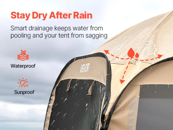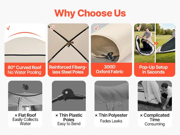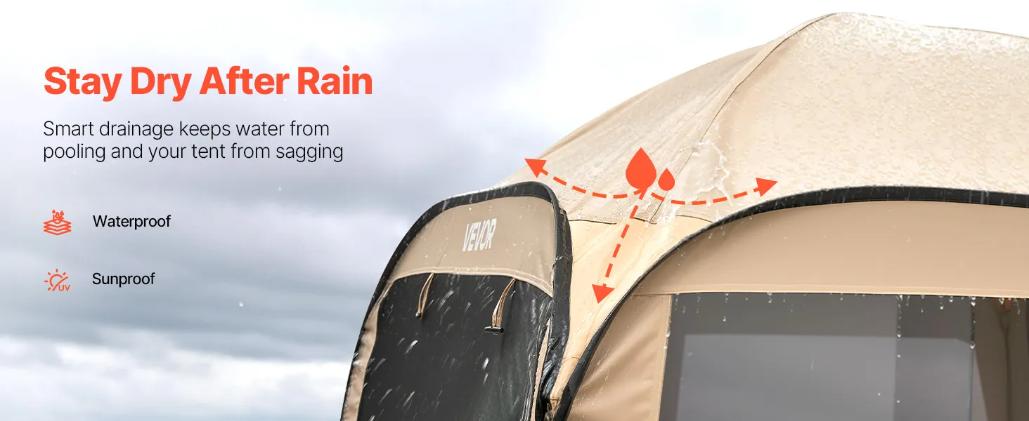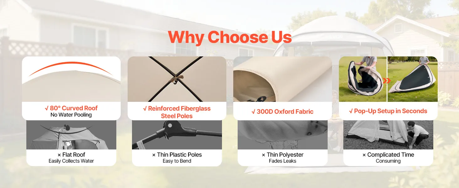 Stabile und windfeste Konstruktion: Verstärkte Fiberglas- und Stahlstangen sorgen dafür, dass das Pop-up-Zelt auch bei Wind stabil steht. Die gewölbte Dachform verhindert Wasseransammlungen und Durchhängen.