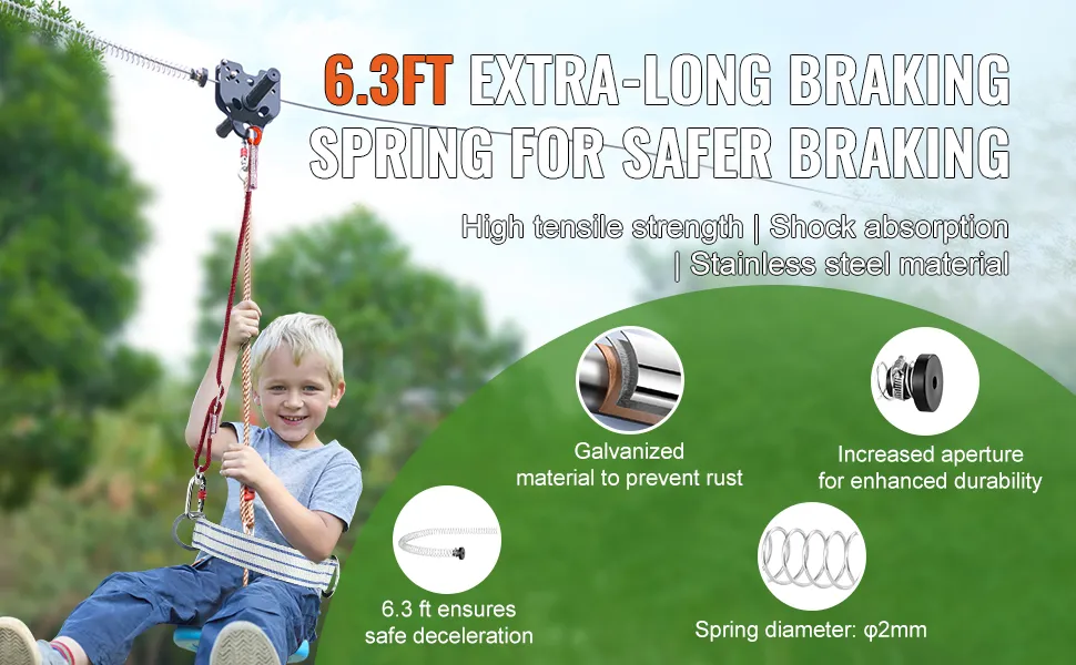 Verbessertes Federbremssystem: Die extra lange Federbremse (6,4 Fuß / 195,07 cm) aus rostfreiem Stahl mit mittlerer Härte bietet eine höhere Belastbarkeit und Haltbarkeit. Sie verhindert ein plötzliches Stoppen der Rutsche. Das Federbremssystem hält den Abstand zwischen den Kindern und den Bäumen und sorgt so für Sicherheit.