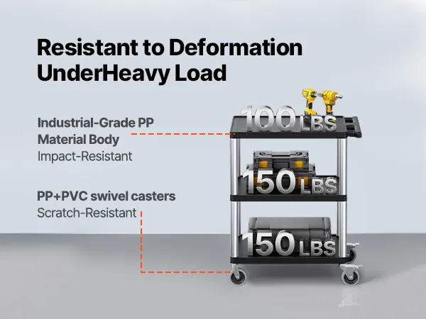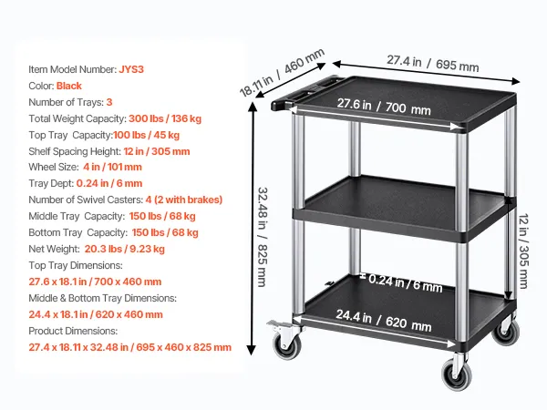 Ideale Größe und hohe Tragkraft: Dieser kompakte und robuste Kunststoffwagen misst 27,4 x 18,11 x 32,48 Zoll / 695 x 460 x 825 mm. Die obere Ablage trägt 100 lbs / 45 kg, die mittlere und untere Ablage jeweils 150 lbs / 68 kg. Dank des 30 cm großen Ablageabstands finden auch hohe Gegenstände problemlos Platz. Beladen Sie Ihr Gepäck sicher, sichern Sie es und rollen Sie sanft!