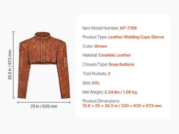 Mit den Maßen 320 x 635 x 673 mm (Umhanglänge x Schulterbreite x Ärmellänge) bietet dieser hitzebeständige Schweißumhang zuverlässigen Schutz für Hals, Arme, Schultern und Brust und schützt Sie beim Schweißen vor Funken, Spritzern und Hitze.