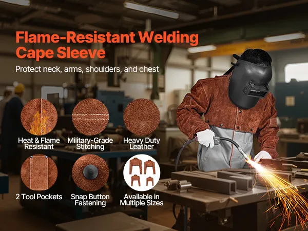 Überragender Schutz: Mit den Maßen 32,5 x 63,5 x 67,5 cm (Umhanglänge x Schulterbreite x Ärmellänge) bietet dieser hitzebeständige Umhang zuverlässigen Schutz für Nacken, Arme, Schultern und Brust. Außerdem verfügt er über zwei Werkzeugtaschen an den Ärmeln für kleine Werkzeuge.