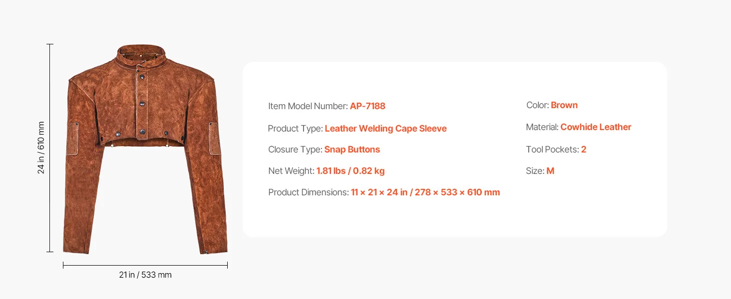 Mit den Maßen 278 x 533 x 610 mm (Umhanglänge x Schulterbreite x Ärmellänge) bietet dieser hitzebeständige Schweißumhang zuverlässigen Schutz für Hals, Arme, Schultern und Brust und schützt Sie beim Schweißen vor Funken, Spritzern und Hitze.