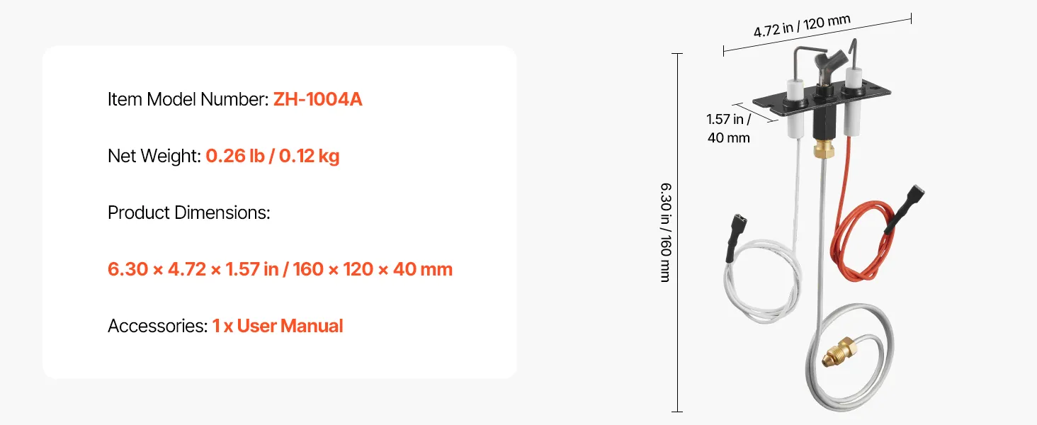 Zündeinheit: Diese Gaszündeinheit besteht aus drei 24-Zoll (60,96 cm)-Teilen (Zündrohr, orangefarbenes Zündkabel, weißes Flammensensorkabel). Ausgestattet mit einem hochwertigen Rohr, hitzebeständiger Verkabelung und einer robusten Halterung sorgt sie für korrosionsbeständige, stabile Heizung