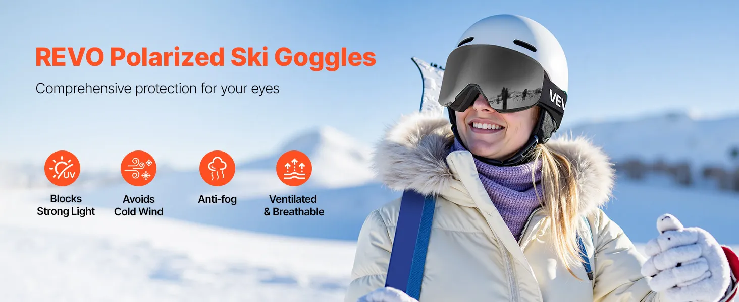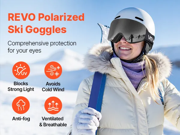 Diese Revo-Skibrille blockiert grelles Sonnenlicht und reduziert die Blendung durch Schnee, um Schneeblindheit vorzubeugen. Sie schützt Sie vor kaltem Wind, sorgt für beschlagfreie Sicht und sorgt für frische Luft, damit Sie jede Abfahrt unbesorgt genießen können.