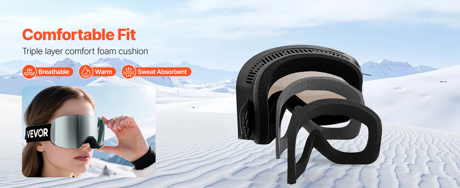 Der weiche dreilagige Schaumstoff der Snowboardbrille passt sich sanft Ihrem Gesicht an, absorbiert Stöße und blockiert kalte Luft. Das atmungsaktive, feuchtigkeitsableitende Design hält Sie warm, schweißfrei und komfortabel für den ganzen Tag Skifahren.