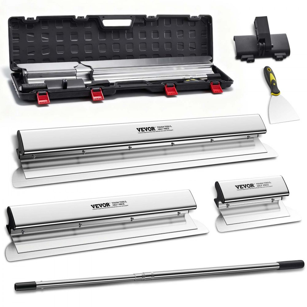 Das VEVOR-Abschäumerklingenset ist aus hochwertigen Materialien gefertigt. Die Klingen sind aus hochwertigen Materialien gefertigt. Sie bestehen aus rostfreiem Stahl, der Haltbarkeit und Langlebigkeit gewährleistet. Die Aluminiumgriffe sind leicht, aber robust. Diese Konstruktion macht diese Werkzeuge sowohl für Heimwerker als auch für Profis zuverlässig. Diese Klingen behalten auch bei häufigem Gebrauch ihre Form und Schärfe. Unser Set umfasst drei verschiedene Klingengrößen: 10", 24" und 32". Diese Größen erfüllen verschiedene Anforderungen an Abschäumer. Sie sorgen für glatte, gleichmäßige Oberflächen. Sie können sie für jede Art von Arbeit in Trockenbauprojekten verwenden oder individuelle Designs erstellen. Die Qualität dieser Messer stellt sicher, dass sie schwere Arbeiten bewältigen können.