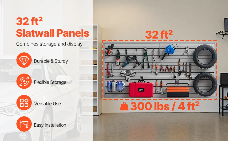 Hohe Tragfähigkeit: Das Lamellenwandpaneel kann bis zu 300 lbs/136 kg tragen und bietet eine stabile und effiziente Lagerung für verschiedene schwere Gegenstände wie Hämmer, Bohrer, Leitern und mehr, was es ideal für den Einsatz in Garagen, Werkstätten und anderen Räumen macht.
