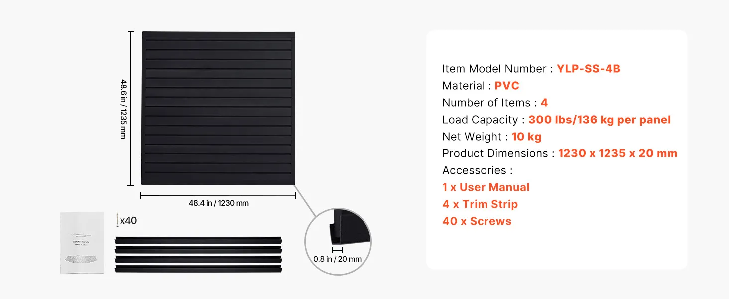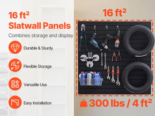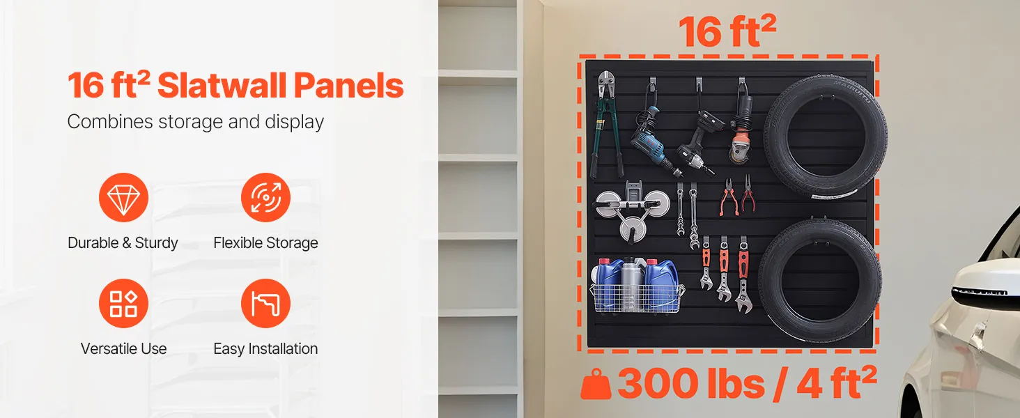 High load-bearing capacity: The slat wall panel can support up to 300 lbs/136 kg and provides stable and efficient storage for various heavy items such as hammers, drills, ladders and more, making it ideal for use in garages, workshops and other spaces.