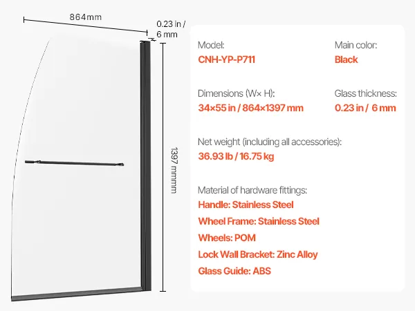 VEVOR rahmenlose Badewannen Duschtür (864 x 1397 mm / B x H) halbe platzsparende Duschtür für Badewanne, 180° drehbare Tür aus gehärtetem Glas, Duschglastür (6 mm Glasdicke), Schwarz