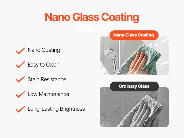 Die innovative Beschichtung dieser halben Duschtür für Badewannen sorgt für einen Selbstreinigungseffekt, sodass Wasser und Schmutz leicht abperlen. Sie verhindert nicht nur Wasserschäden und Korrosion, sondern verlängert auch die Lebensdauer des Glases und verbessert so die Gesamteleganz Ihrer Badewannenabtrennung.