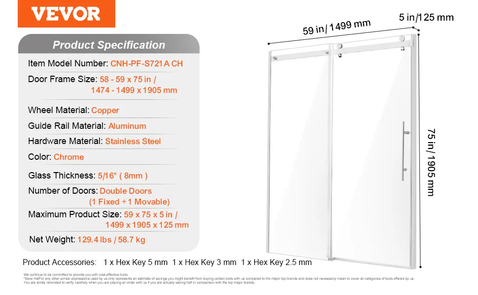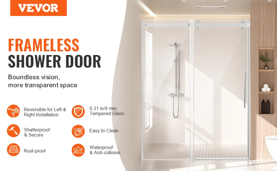 VEVOR rahmenlose Duschtür Schiebetür für Duschabtrennung 1474-1499 x 1905 mm, Dusch-Glasschiebetür mit 8 mm klarem Hartglas, wasserdicht bruchsicher schmutzabweisend, mit Edelstahlbeschlägen