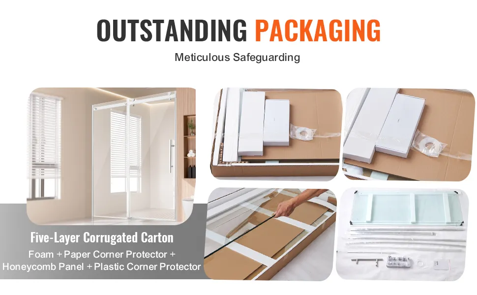 Die Außenverpackung der halbrahmenlosen Duschschiebetür besteht aus einer fünflagigen Wellpappe, die mit Schaumstoff, Papierecken, Wabenplatten und Kunststoffecken ausgekleidet ist, um die Integrität vom Werk bis zum Einbau zu maximieren.