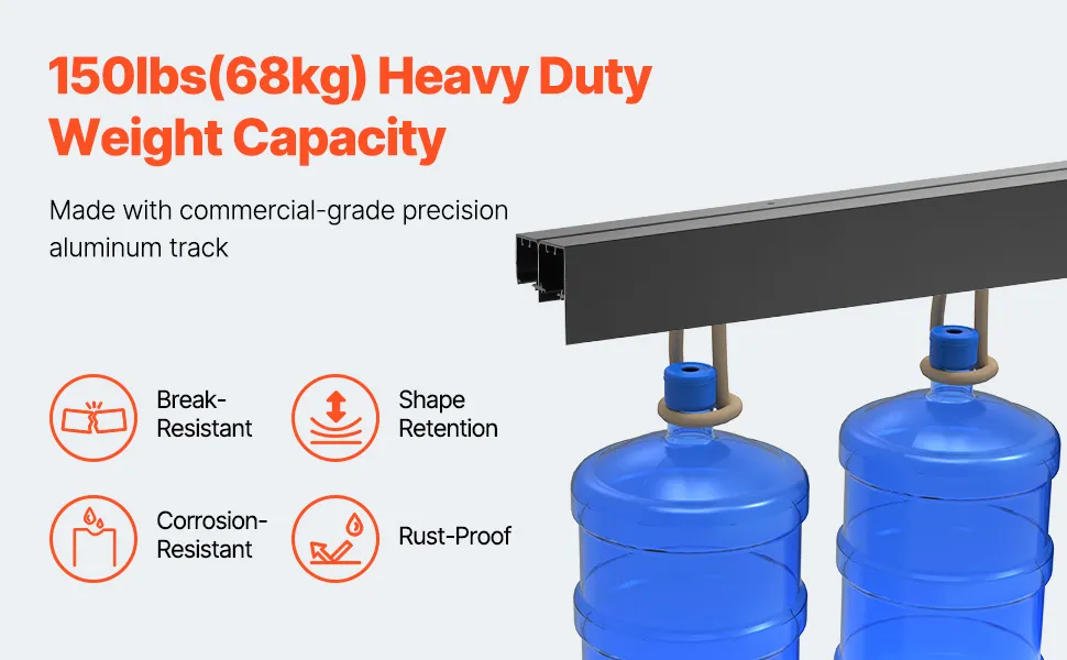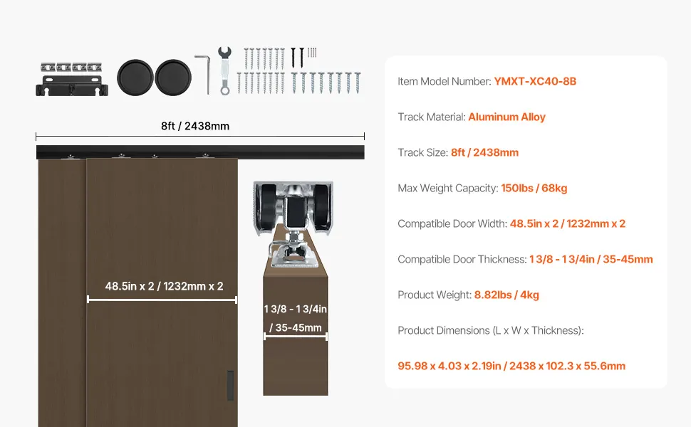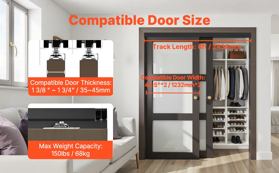 Anwendbare Tür: Dieses 8 Fuß (2438 mm) lange Türbeschlagset passt für Türpaneele mit einer Dicke von 1-3/8 bis 1-3/4 Zoll (35 bis 45 mm) und einer Breite von 48,5 Zoll x 2 (1232 mm x 2). Es trägt ein maximales Gewicht von 150 lbs (68 kg), sodass Sie die richtige Größe entsprechend Ihren Anforderungen auswählen können.