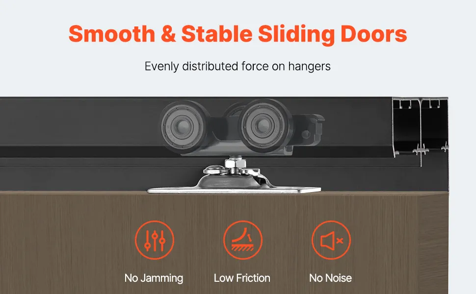 Stabil & reibungslos: Das Schiebetür-Hardware-Kit enthält dreirädrige Aufhänger, die das Gewicht der Tür gleichmäßig auf jedes Rad verteilen. Hochleistungskugellager minimieren die Reibung und sorgen für eine leise, reibungslose und stabile Türbewegung.
