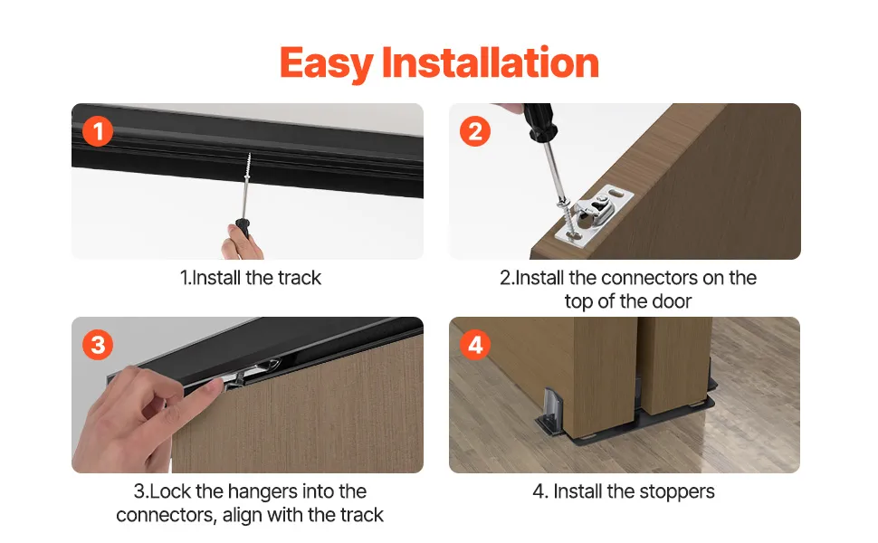 Einfach zu installieren: Das Schiebetür-Hardware- und Schienenset verfügt über eine einfache Struktur mit Schnellverschlussplatten für eine einfache Türinstallation und -entfernung, was Zeit und Mühe spart. Selbst Benutzer ohne Berufserfahrung können es problemlos installieren, indem sie den Anweisungen folgen.