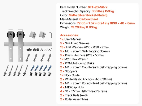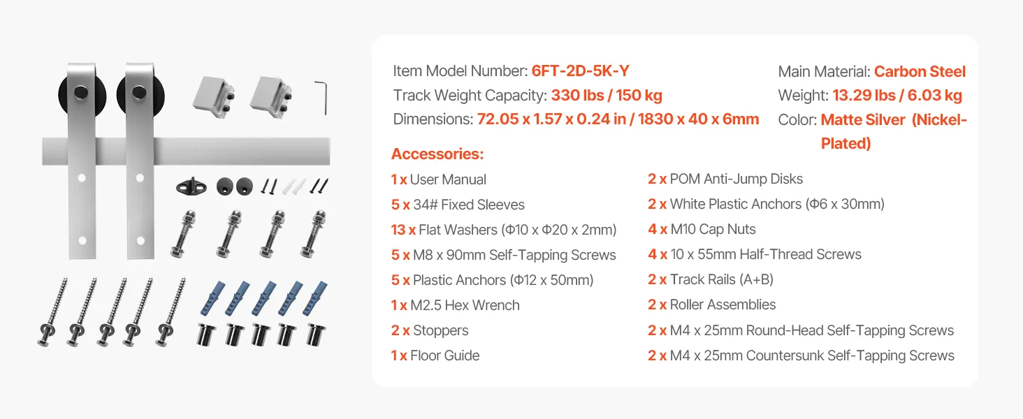 VEVOR Schiebetürsystem 183 cm Laufschiene, Schiebetürbeschlag Tragkraft 150 kg, kompatibel mit 914 mm max. Breite und 34,92-44,45 mm Dicke, Schiene & J-förmige Rolle, Silber