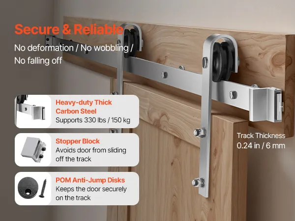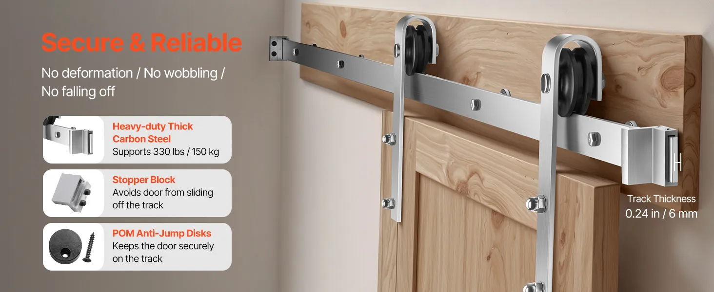Diese Scheunentorschiene aus dickem, robustem Kohlenstoffstahl stützt Ihre Türen, ohne sich zu verbiegen oder zu verziehen. Dank der Anschlagblöcke und der POM-Sprungsicherung müssen Sie sich keine Sorgen mehr machen, dass die Tür abrutscht oder herumspringt – für mehr Sicherheit!