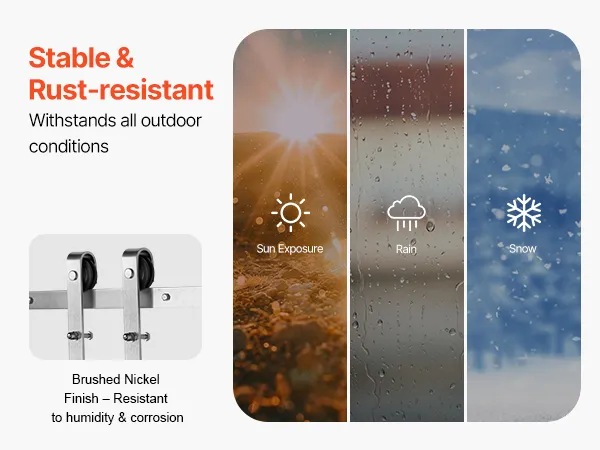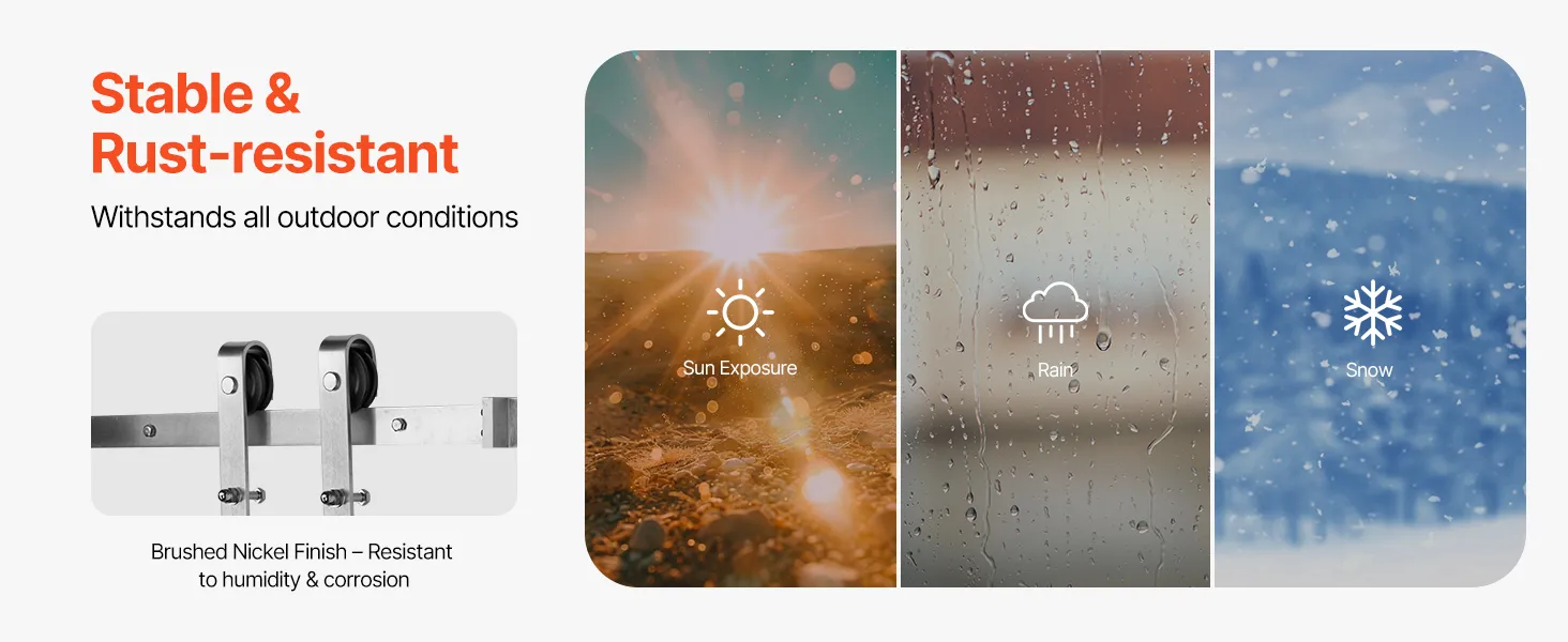 Die glänzende Oberfläche aus gebürstetem Nickel verleiht Ihrem Raum eine elegante Note und sorgt gleichzeitig dafür, dass Ihr Schiebetor-Beschlagset rostfrei und witterungsbeständig bleibt. Es ist ideal für den Innen- und Außenbereich und bleibt bei minimalem Pflegeaufwand jahrelang schön.