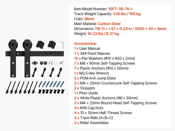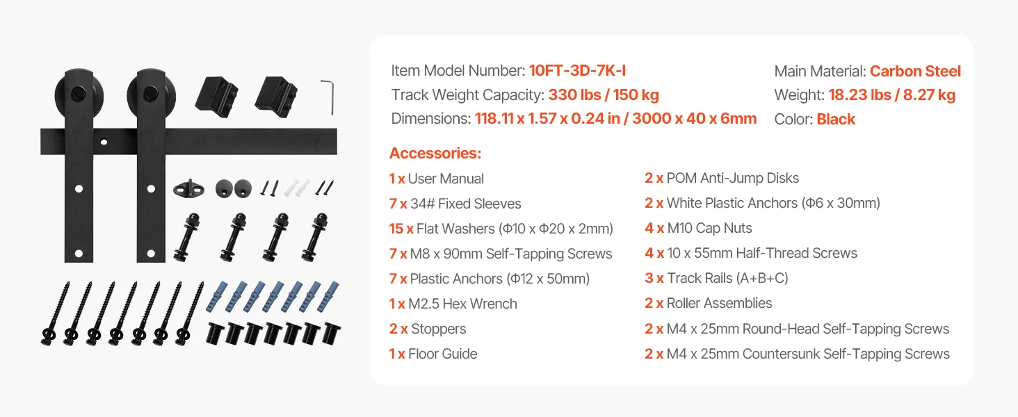 VEVOR Schiebetürsystem 3 m, Schiebetür Beschlag Tragkraft 150 kg, kompatibel mit einer maximalen Breite von 1524 mm und einer Dicke von 34,92 mm bis 44,45 mm, I-förmige Rolle, Schwarz