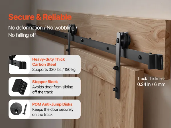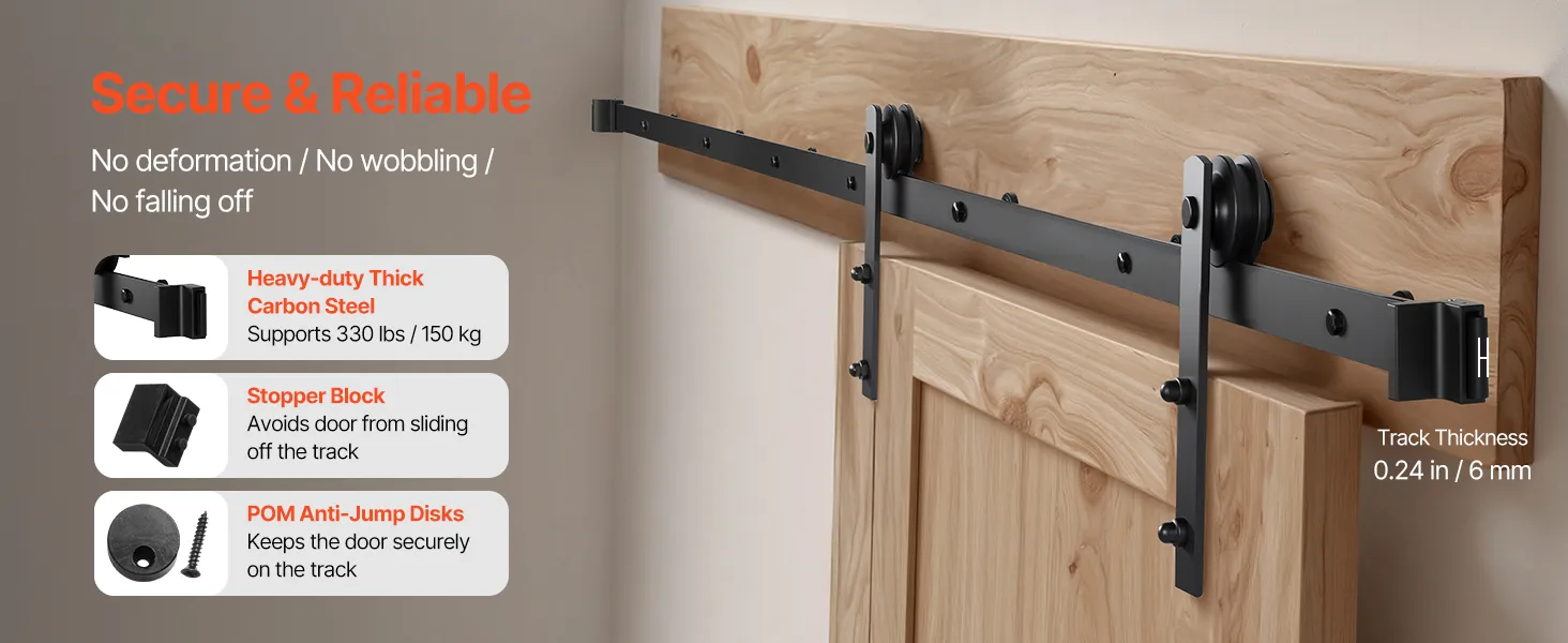 Diese Scheunentorschiene aus dickem, robustem Kohlenstoffstahl stützt Ihre Türen, ohne sich zu verbiegen oder zu verziehen. Dank der Anschlagblöcke und der POM-Anti-Sprung-Elemente müssen Sie sich keine Sorgen mehr machen, dass die Tür abrutscht oder herumspringt – für mehr Sicherheit!