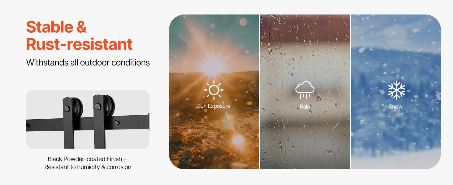 Dieses Schiebetor-Set mit robuster Schwarzpulverbeschichtung ist feuchtigkeitsbeständig, rostfrei und für jedes Wetter geeignet – egal ob Regen, Sonnenschein oder Schnee. So bleiben Ihre Türen auch ohne ständige Pflege schön.